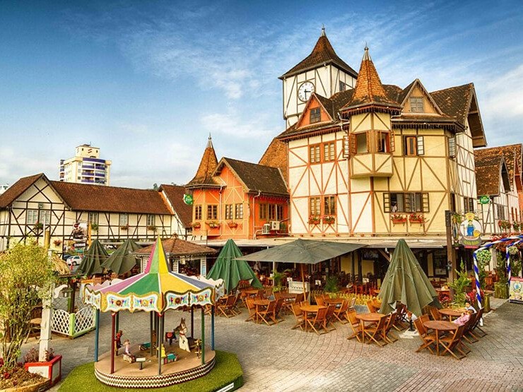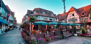 Blumenau: E a nossa jornada não para por aí! Para fechar o dia com chave de ouro, seguiremos para a charmosa Vila Germânica. É o momento perfeito para passear entre as casinhas em estilo enxaimel, garantir aqueles artesanatos típicos maravilhosos e sentir toda a energia da cultura europeia.