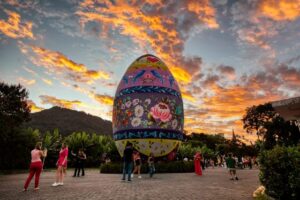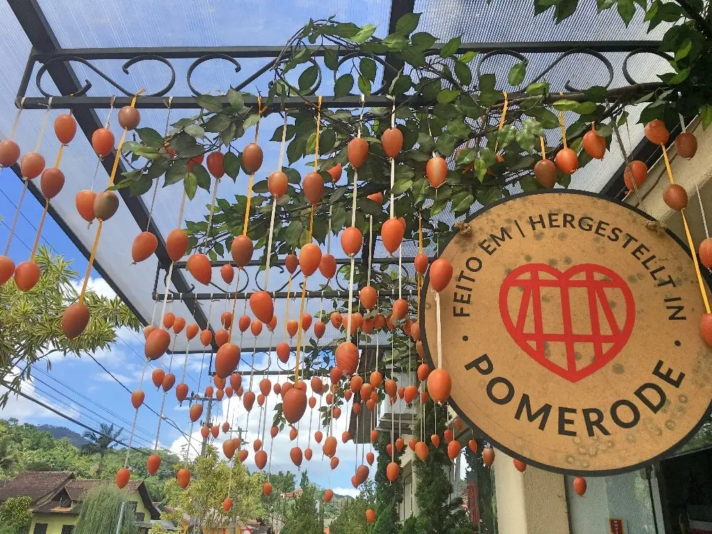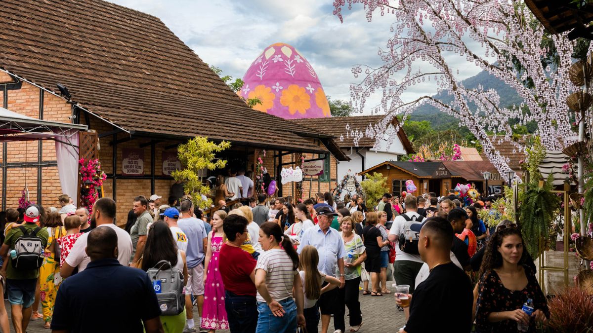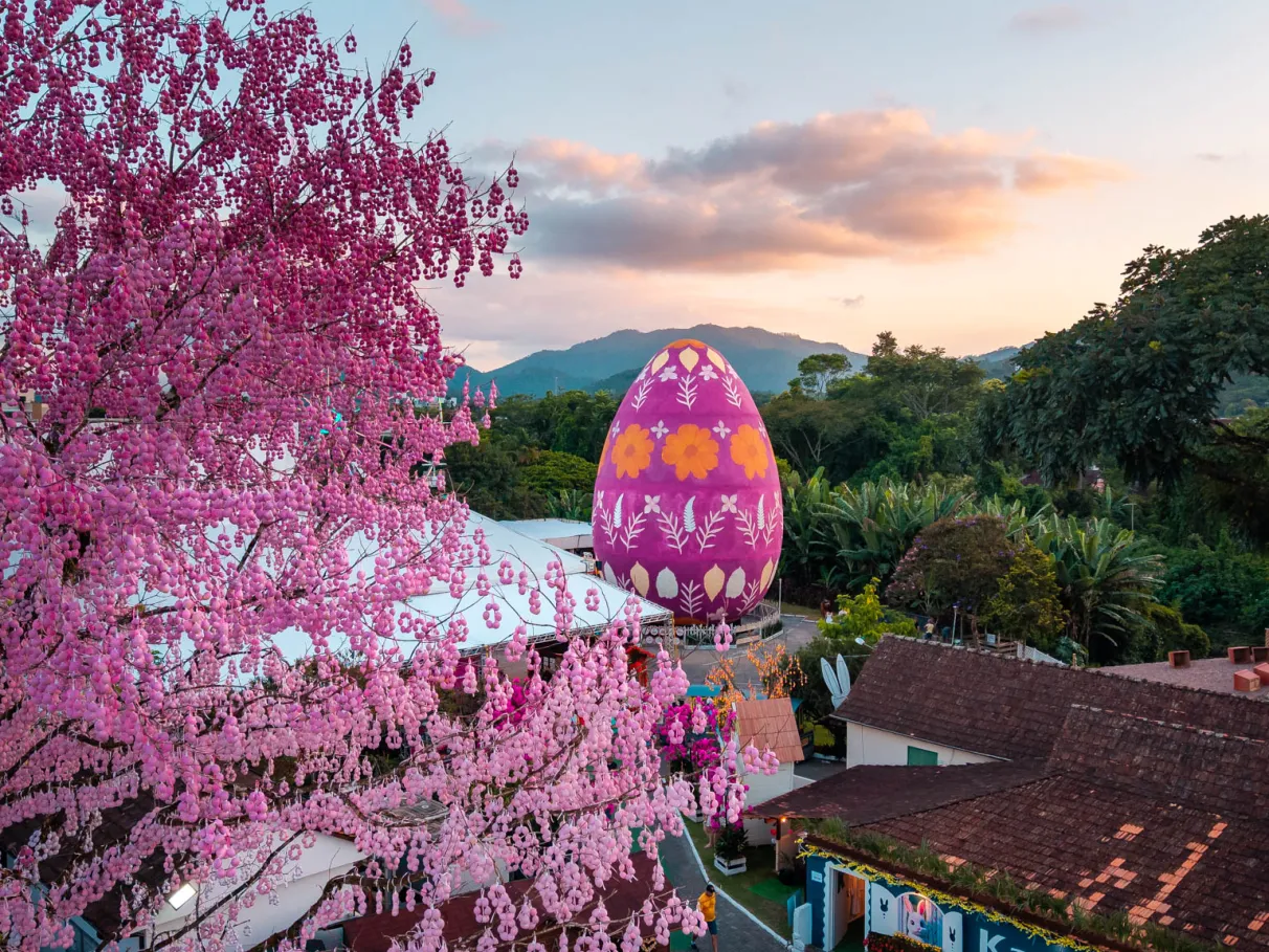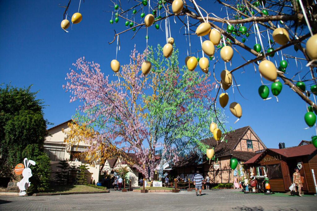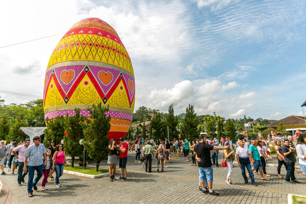 Pomerode: Vamos visitar o icônico portal da cidade, conhecer a tradição da Porcelana Schmidt e mergulhar na magia da Osterfest. Você vai se encantar com a maior árvore de Páscoa do mundo (Osterbaum) e o ovo gigante decorado!